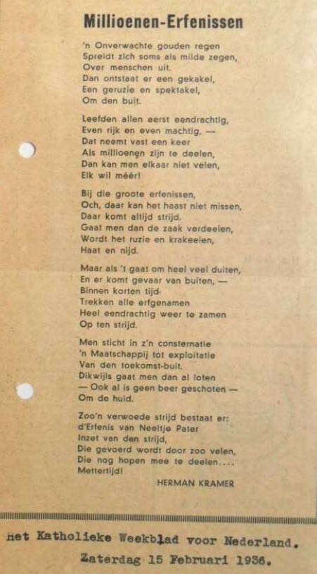 Ook mijn familie vroeg zich af, of zij verwant was aan Neeltje de Pater, maar heeft dat niet verder uitgezocht. Vader heeft de krantenknipsels rondom de erfenis netjes in een map bewaard en daarin vond ik ook het gedicht dat naar aanleiding van de jacht op de erfenis geschreven werd: