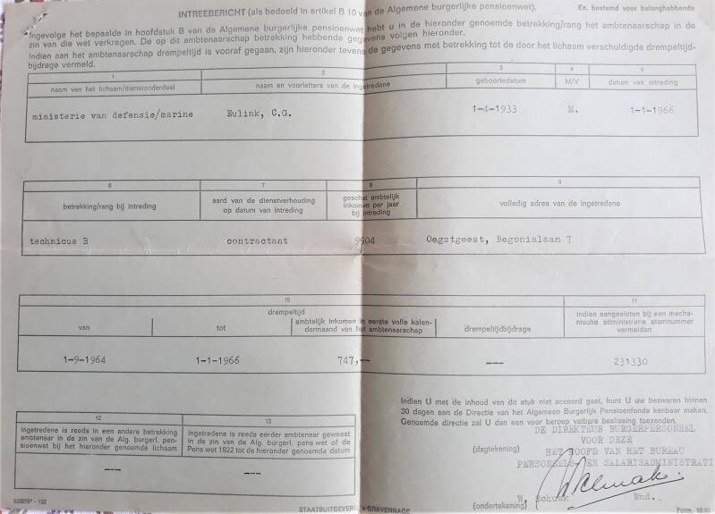 “Op 1 september 1965 ben ik in Oegstgeest begonnen en die dag was natuurlijk erg onwennig, want ik kende er niemand en de sfeer bij de marine was heel anders dan bij mijn vorige werkgever. Na afloop van de eerste werkdag stapte ik de poort uit en plotseling hoorde ik mijn naam noemen: ‘Kees, wat doe jíj hier?’ Verbaasd keek ik op en naast mij stond mijn oude schoolkameraad Kees van Daalen, die er ook werkte.”