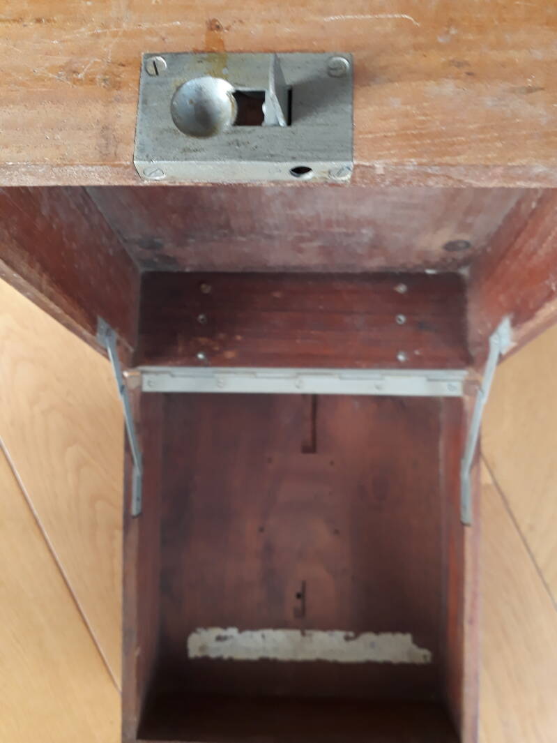 Het plaatje moest hij van mij op de buitenkant vastspijkeren, want dat vond ik mooier, met originele spijkertjes bij het leren handvat. “Maar daar hoort het niet hoor!”. Hij vond het maar niets. Later was ik vergeten waar het plaatje oorspronkelijk had moeten zitten.