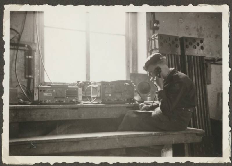 Oefening IJspegel vond plaats in het waterzuiveringsgebouw tegen de duinen van Hilversum. Het laboratorium werd als slaapplaats benut. We zien twee groepsopstellingen van mannen met verkleumde gezichten en een foto waarop te zien is hoe ze in de ijzige kou een antenne afbreken. Dat het koud is, geeft de ondertitel bij de foto aan en de veelzeggende schets.