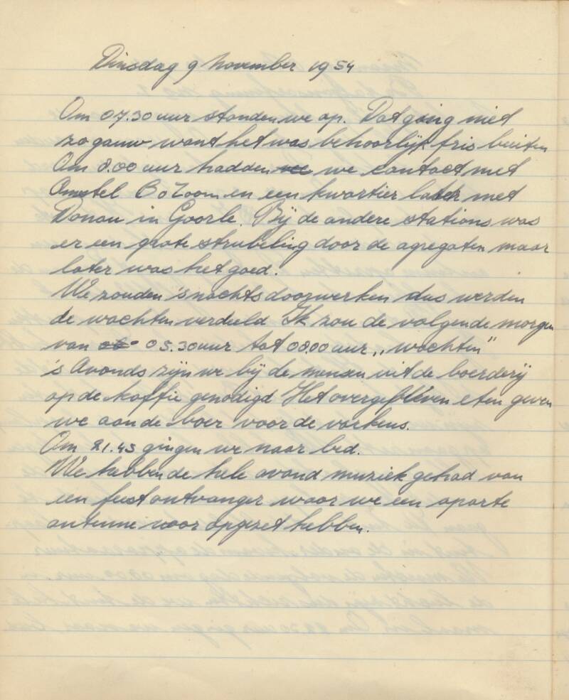 Ik stond vanmorgen om 07.45 uur op. De sergeant ging met de chauffeur eten halen in Breda. De verbinding was weer goed. Tot 13.00 uur toen kwam er een vreemd station de goede gang van zaken verstoren. Het was ook een antre-station met de namen Ajax - Beker - Rudolf. Dit heeft een uur geduurd. Toen zijn ze op een andere frequentie overgegaan. De sergeant is met de chauffeur op een ‘testrit’ geweest. Hij bracht 3 sigaren mee. Wij zaten hier meer als normaal, want je verveel je dood, niets te lezen of te zien we zijn helemaal afgezonderd. De post Biesbos is teruggegaan naar Bergen op Zoom.